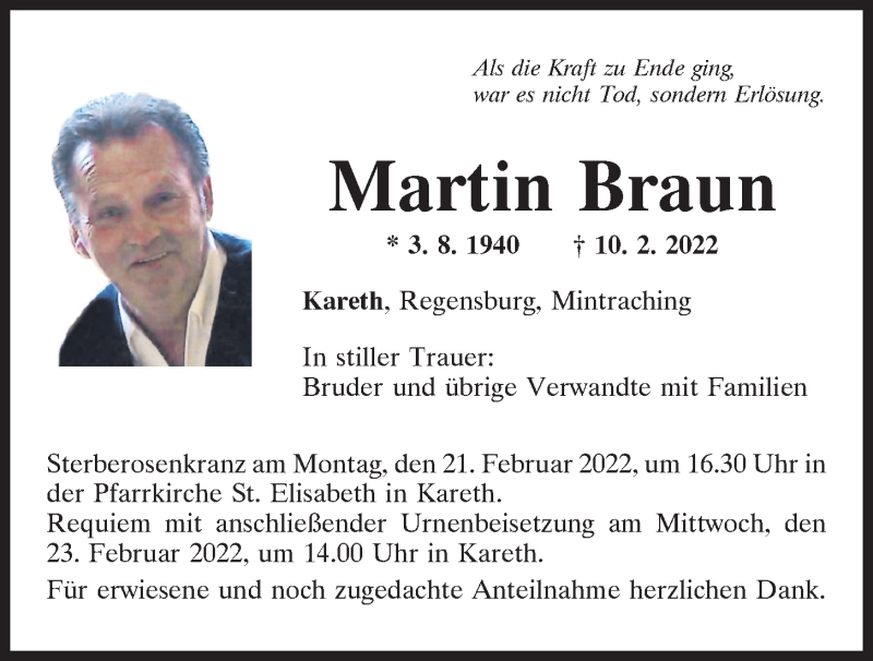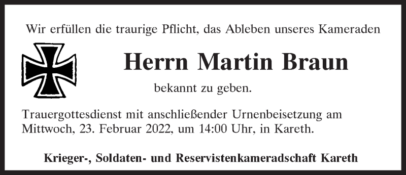 Hier finden Sie alle Traueranzeigen aus der Zeitung, die bisher für Martin Braun erschienen sind.