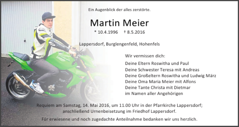 Hier finden Sie alle Traueranzeigen aus der Zeitung, die bisher für Martin Meier erschienen sind.