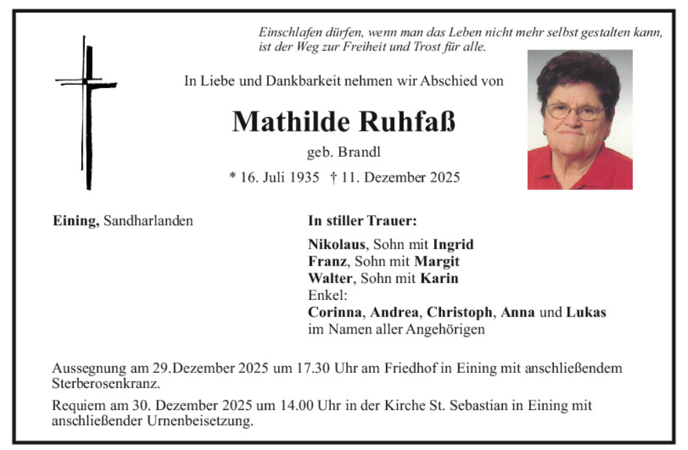 Hier finden Sie alle Traueranzeigen aus der Zeitung, die bisher für Mathilde Ruhfaß erschienen sind.