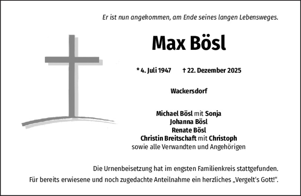 Hier finden Sie alle Traueranzeigen aus der Zeitung, die bisher für Max Bösl erschienen sind.