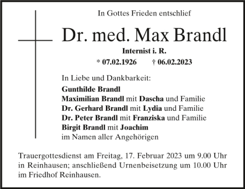 Hier finden Sie alle Traueranzeigen aus der Zeitung, die bisher für MAx Brandl erschienen sind.