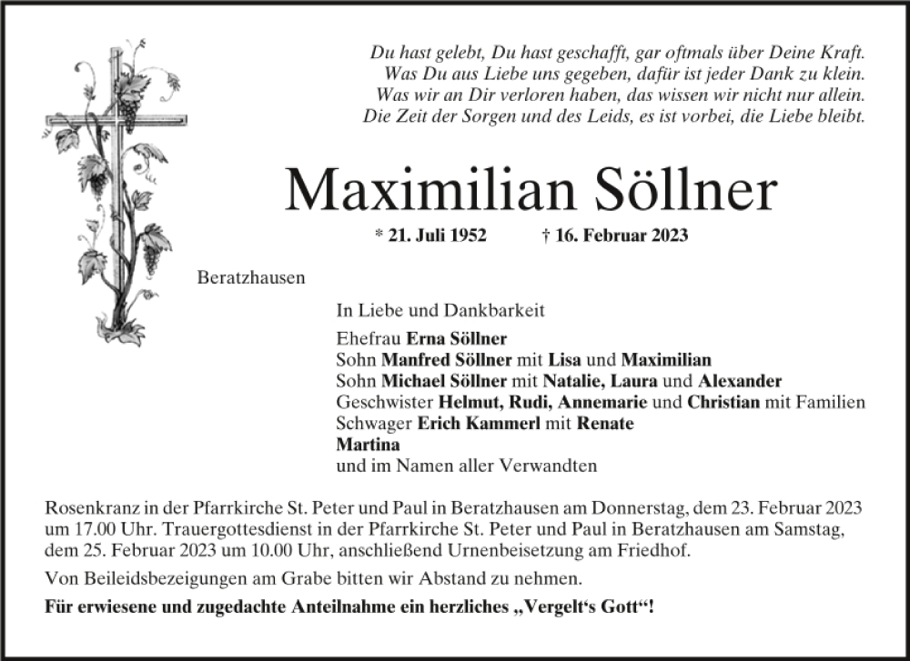 Hier finden Sie alle Traueranzeigen aus der Zeitung, die bisher für Maximilian Söllner erschienen sind.
