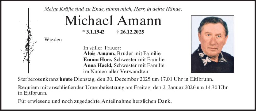 Hier finden Sie alle Traueranzeigen aus der Zeitung, die bisher für Michael Amann erschienen sind.