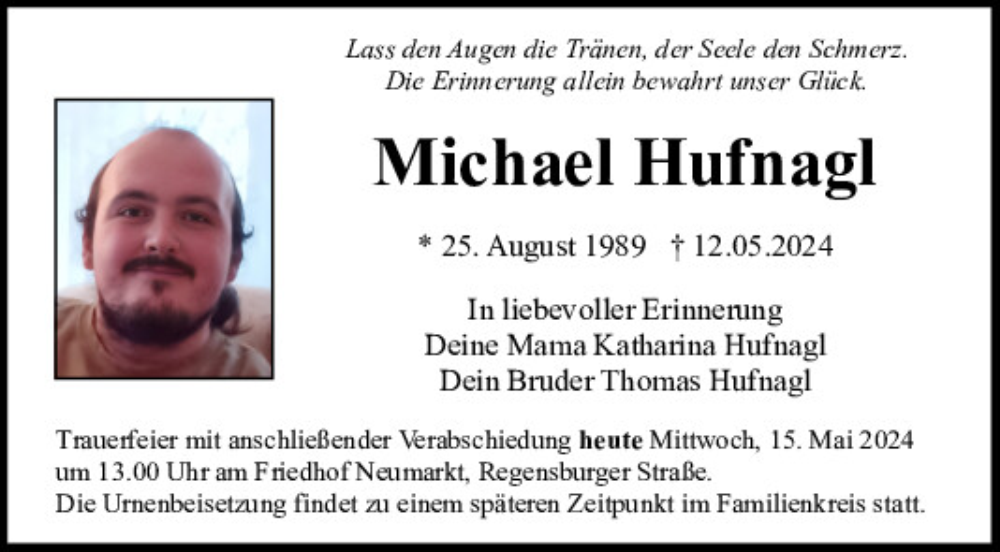 Hier finden Sie alle Traueranzeigen aus der Zeitung, die bisher für Michael Hufnagl erschienen sind.