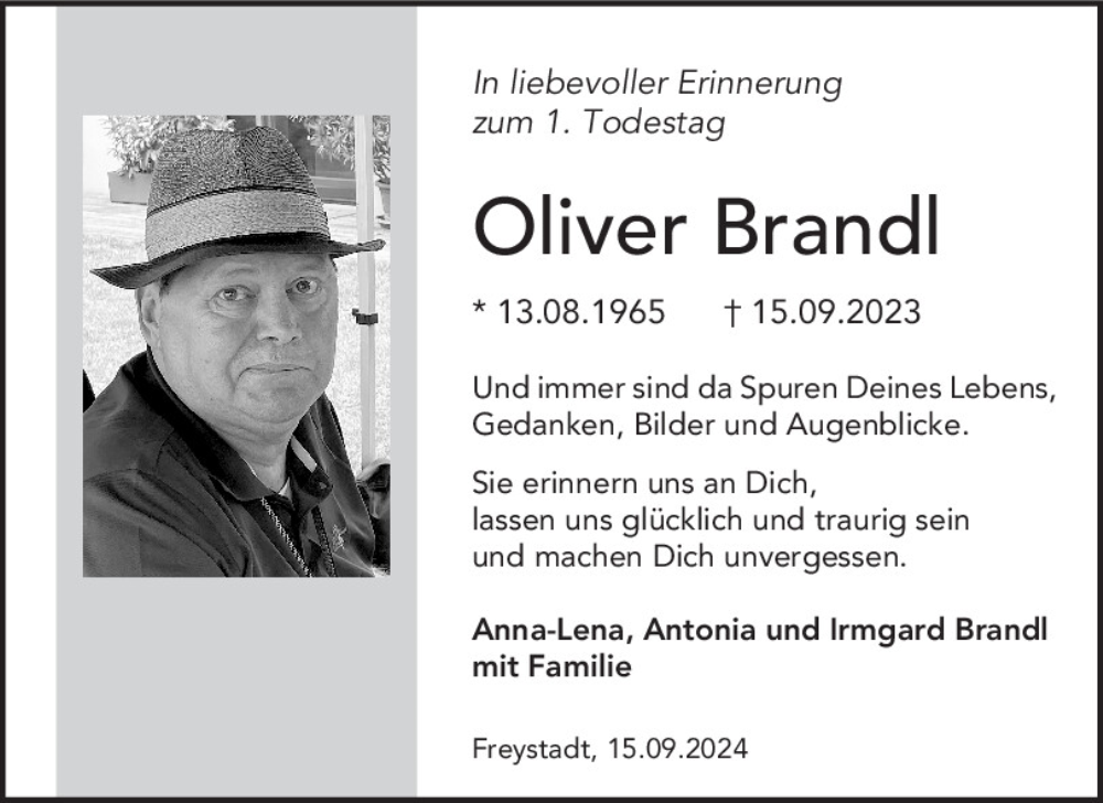 Hier finden Sie alle Traueranzeigen aus der Zeitung, die bisher für Oliver Brandl erschienen sind.