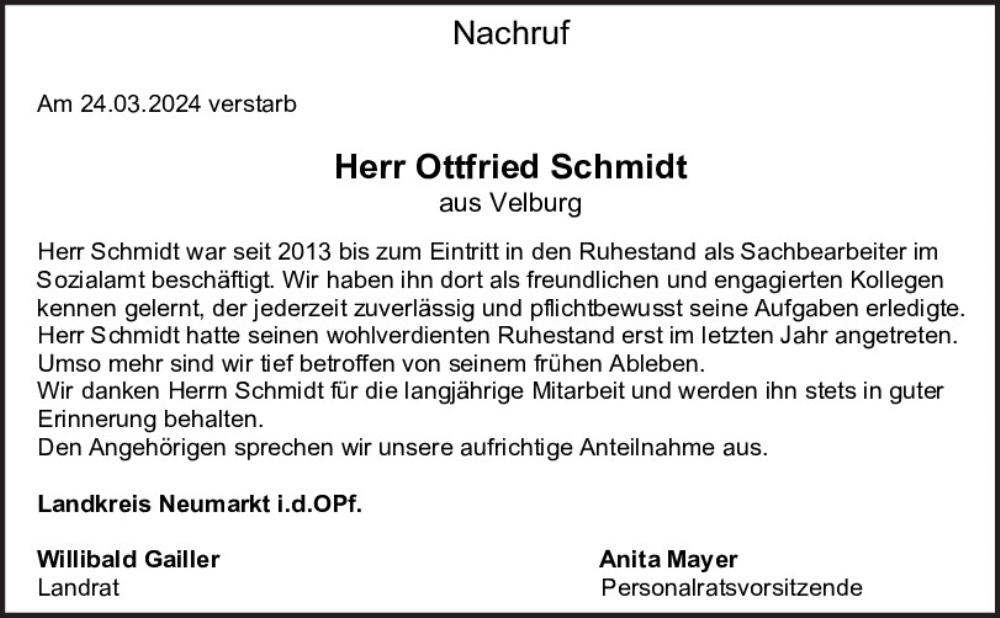Hier finden Sie alle Traueranzeigen aus der Zeitung, die bisher für Ottfried Schmidt erschienen sind.