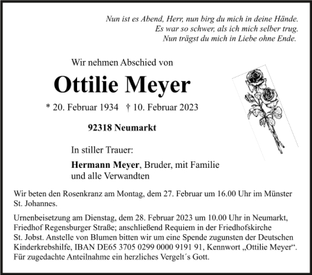 Hier finden Sie alle Traueranzeigen aus der Zeitung, die bisher für Ottilie Meyer erschienen sind.