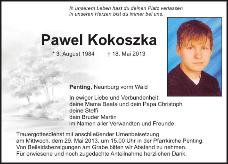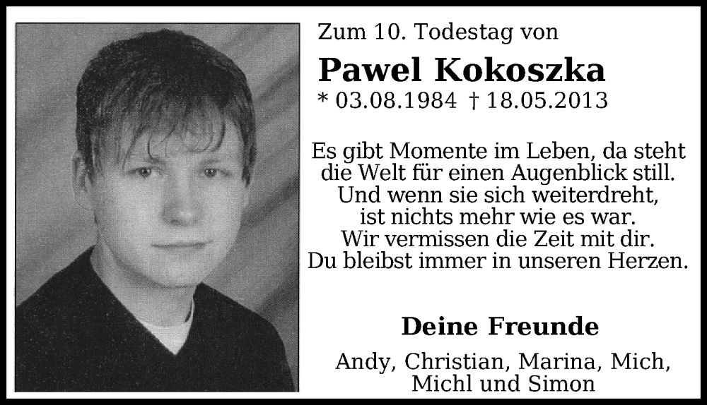 Hier finden Sie alle Traueranzeigen aus der Zeitung, die bisher für Pawel Kokoszka erschienen sind.