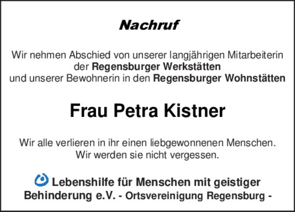 Hier finden Sie alle Traueranzeigen aus der Zeitung, die bisher für Petra Kistner erschienen sind.