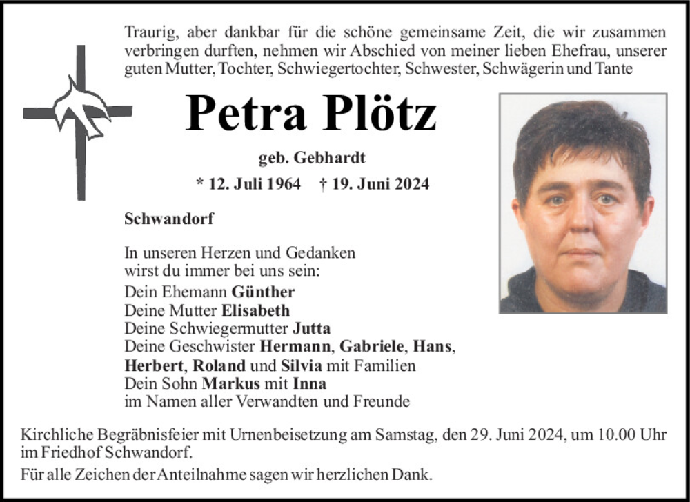 Hier finden Sie alle Traueranzeigen aus der Zeitung, die bisher für Petra Plötz erschienen sind.