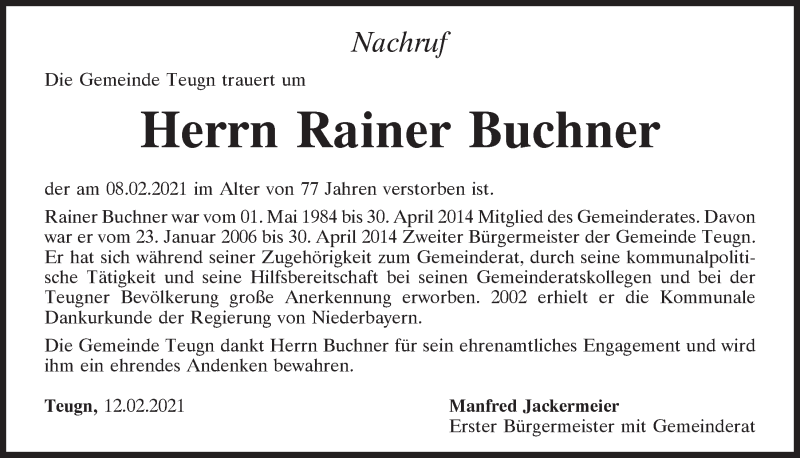 Hier finden Sie alle Traueranzeigen aus der Zeitung, die bisher für Rainer Buchner erschienen sind.