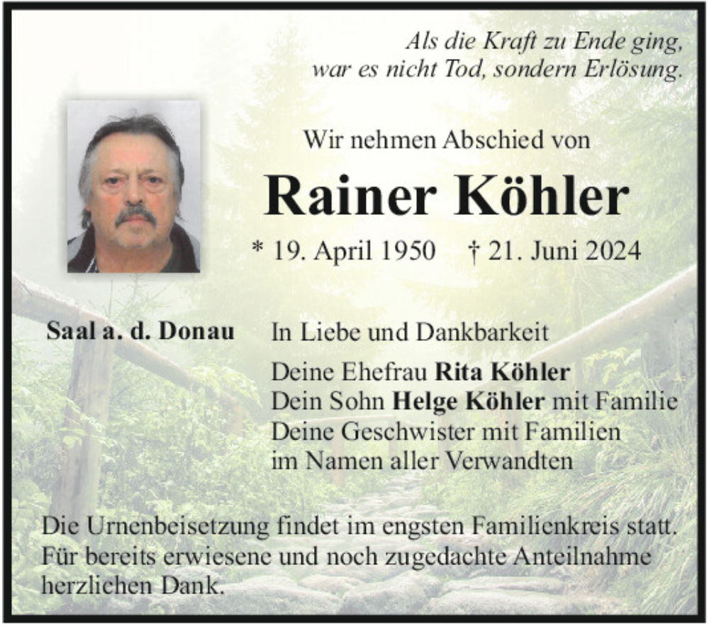Hier finden Sie alle Traueranzeigen aus der Zeitung, die bisher für Rainer Köhler erschienen sind.