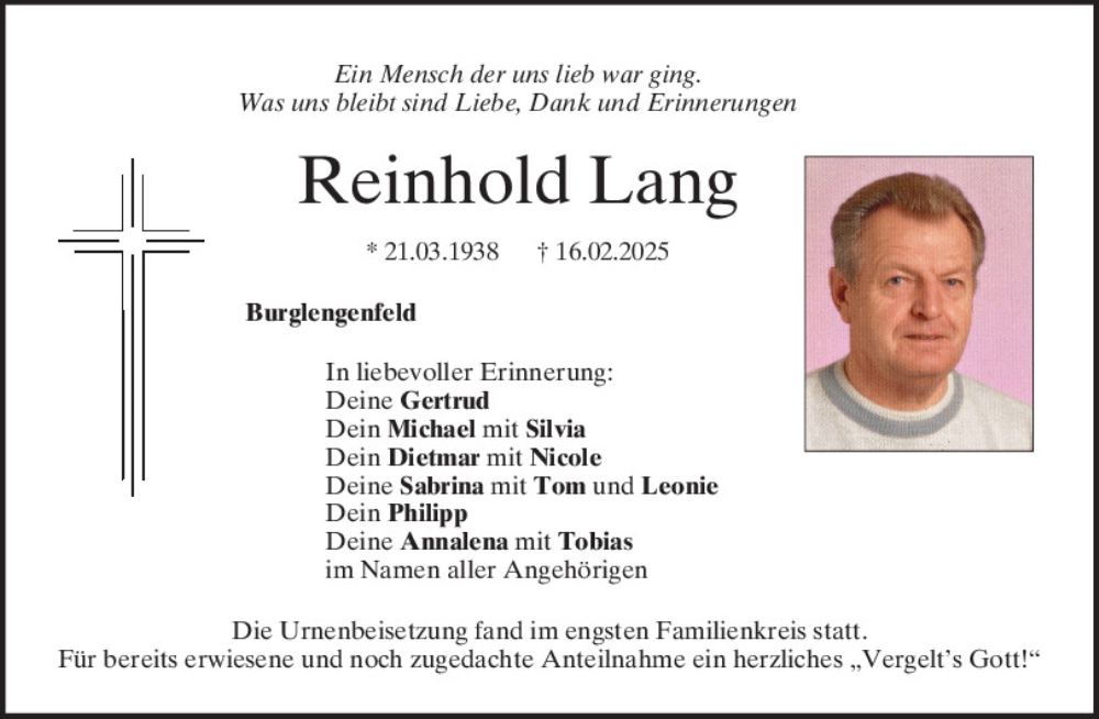 Hier finden Sie alle Traueranzeigen aus der Zeitung, die bisher für Reinhold Lang erschienen sind.