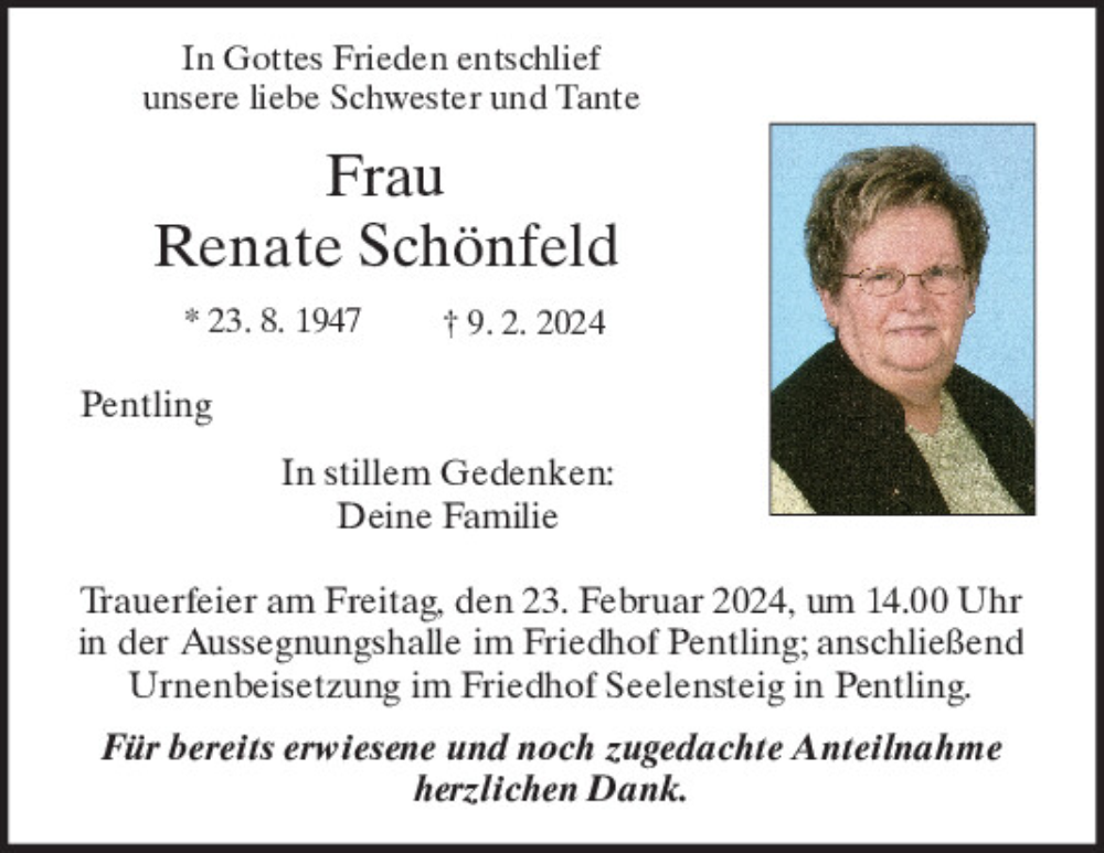 Hier finden Sie alle Traueranzeigen aus der Zeitung, die bisher für Renate Schönfeld erschienen sind.