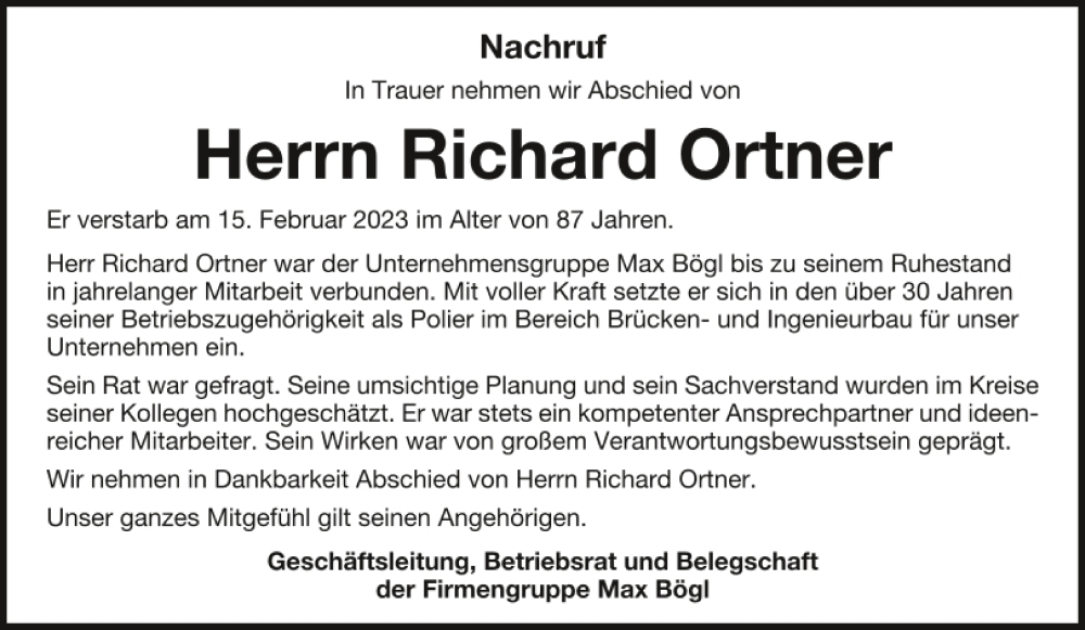 Hier finden Sie alle Traueranzeigen aus der Zeitung, die bisher für Richard Ortner erschienen sind.