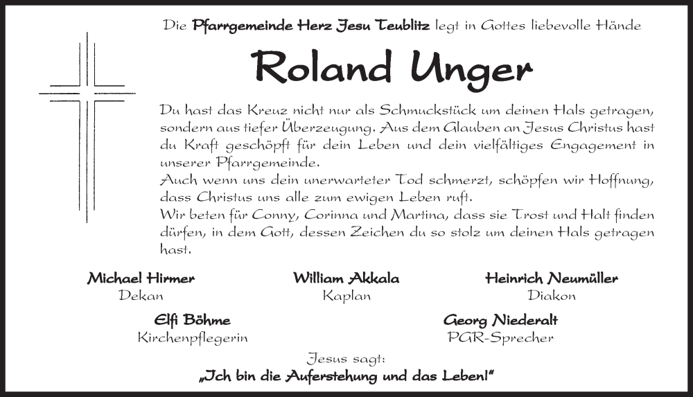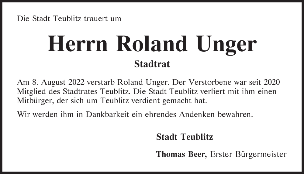 Hier finden Sie alle Traueranzeigen aus der Zeitung, die bisher für Roland Unger erschienen sind.