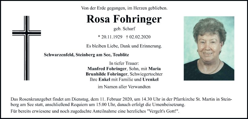 Hier finden Sie alle Traueranzeigen aus der Zeitung, die bisher für Rosa Fohringer erschienen sind.
