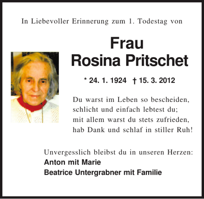 Hier finden Sie alle Traueranzeigen aus der Zeitung, die bisher für Rosina Pritschet erschienen sind.