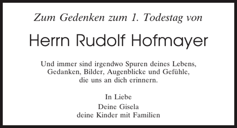 Hier finden Sie alle Traueranzeigen aus der Zeitung, die bisher für Rudolf Hofmayer erschienen sind.