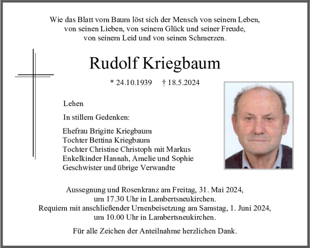 Hier finden Sie alle Traueranzeigen aus der Zeitung, die bisher für Rudolf Kriegbaum erschienen sind.