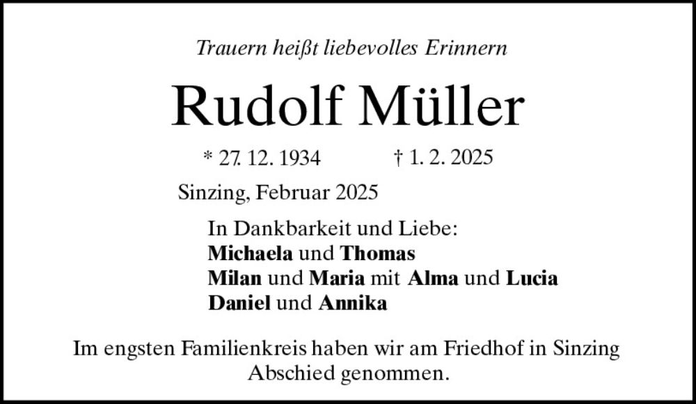 Hier finden Sie alle Traueranzeigen aus der Zeitung, die bisher für Rudolf Müller erschienen sind.