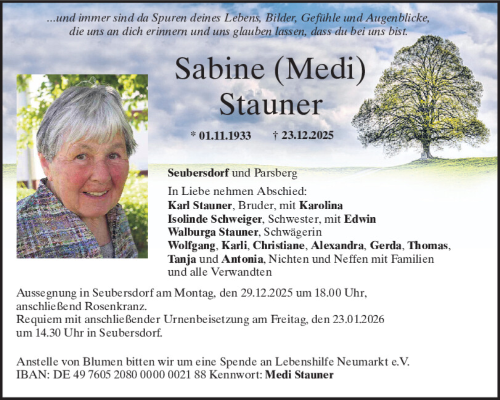 Hier finden Sie alle Traueranzeigen aus der Zeitung, die bisher für Sabine Stauner erschienen sind.