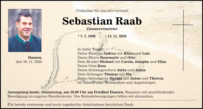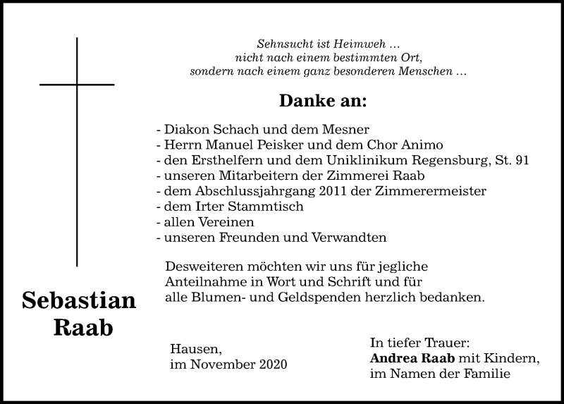 Hier finden Sie alle Traueranzeigen aus der Zeitung, die bisher für Sebastian Raab erschienen sind.