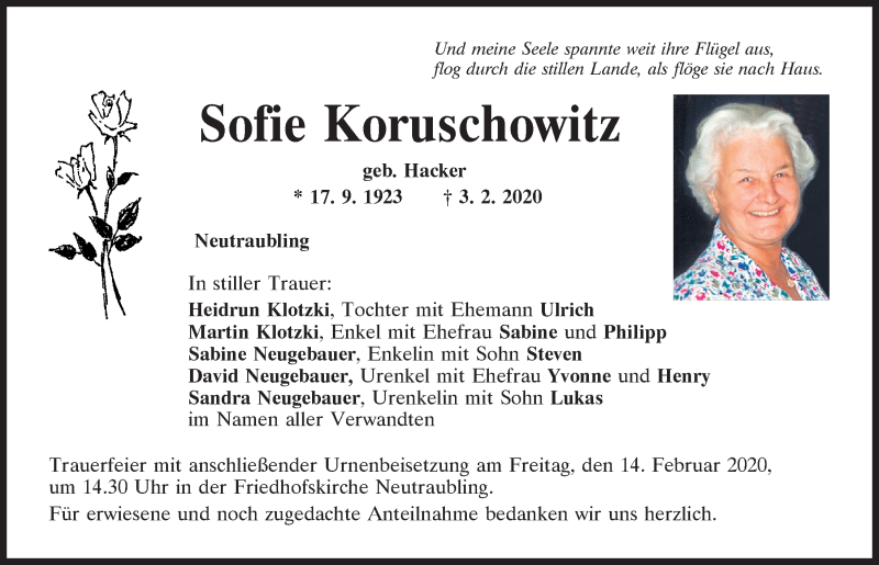Hier finden Sie alle Traueranzeigen aus der Zeitung, die bisher für Sofie Koruschowitz erschienen sind.
