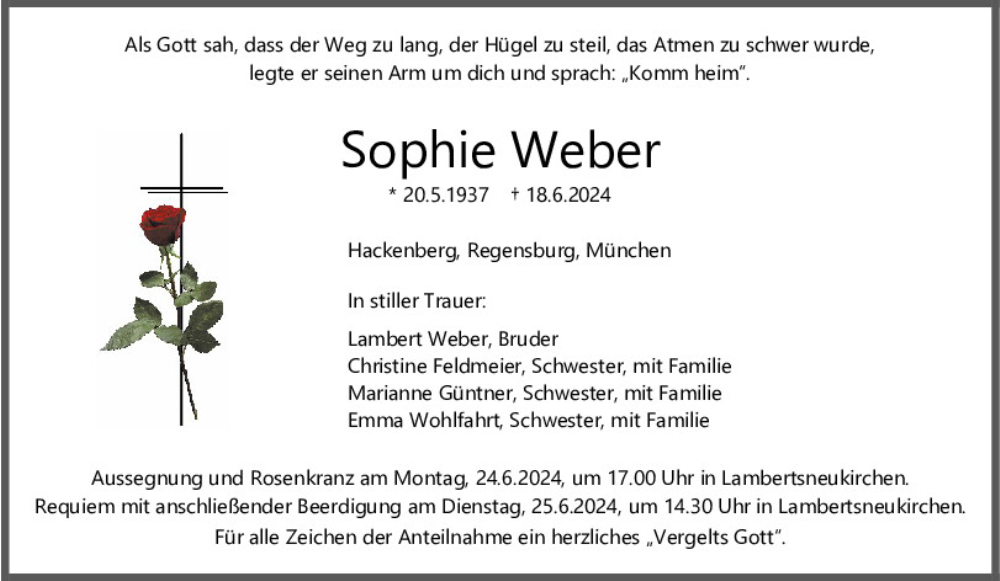 Hier finden Sie alle Traueranzeigen aus der Zeitung, die bisher für Sophie Weber erschienen sind.