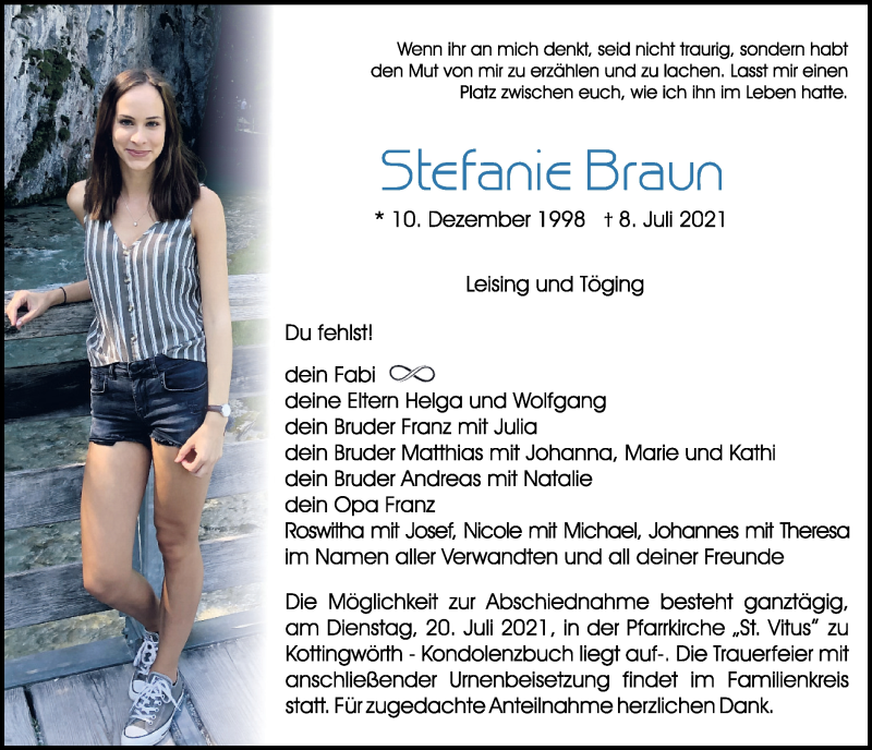 Hier finden Sie alle Traueranzeigen aus der Zeitung, die bisher für Stefanie Braun erschienen sind.