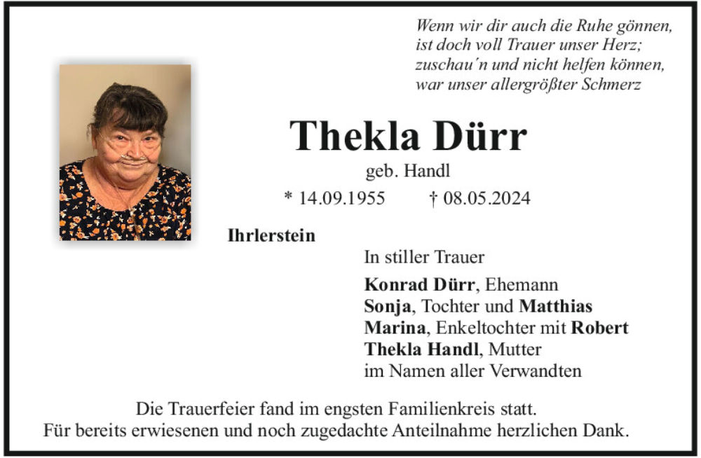 Hier finden Sie alle Traueranzeigen aus der Zeitung, die bisher für Thekla Dürr erschienen sind.