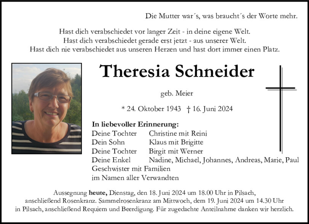 Hier finden Sie alle Traueranzeigen aus der Zeitung, die bisher für Theresia Schneider erschienen sind.