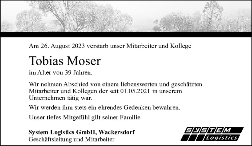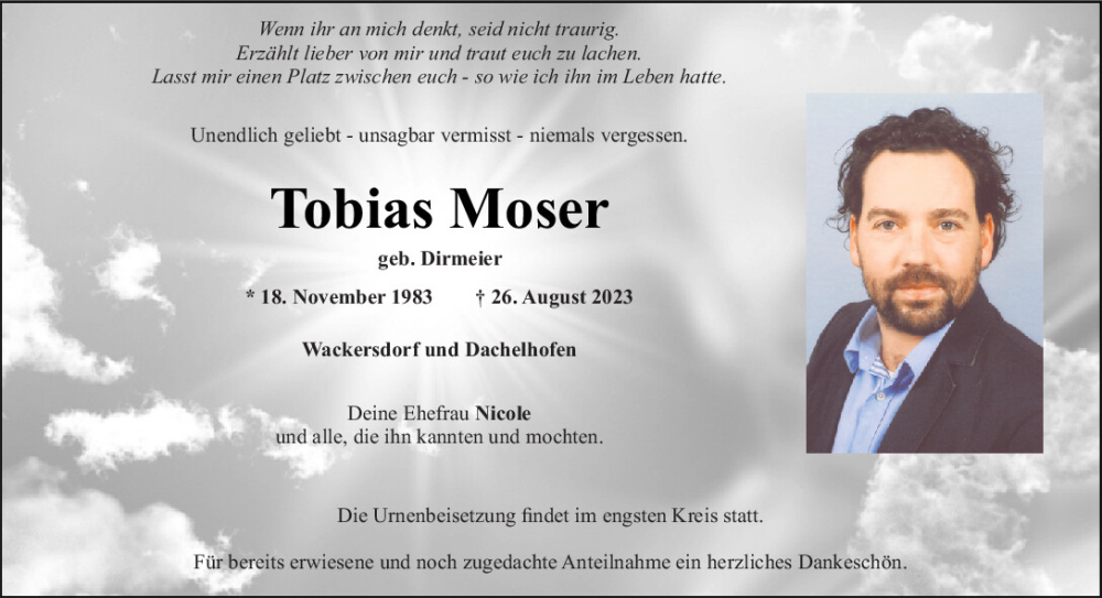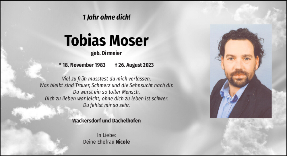Hier finden Sie alle Traueranzeigen aus der Zeitung, die bisher für Tobias Moser erschienen sind.