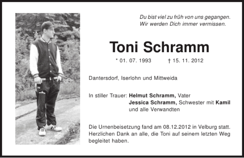 Hier finden Sie alle Traueranzeigen aus der Zeitung, die bisher für Toni Schramm erschienen sind.