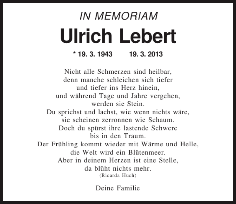 Hier finden Sie alle Traueranzeigen aus der Zeitung, die bisher für Ulrich Lebert erschienen sind.