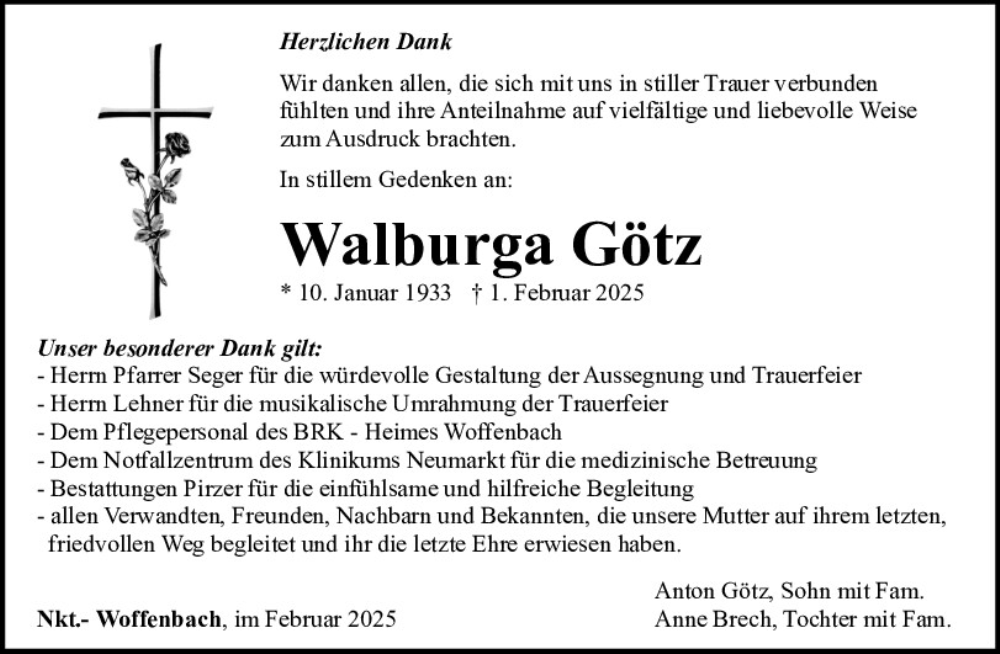 Hier finden Sie alle Traueranzeigen aus der Zeitung, die bisher für Walburga Götz erschienen sind.