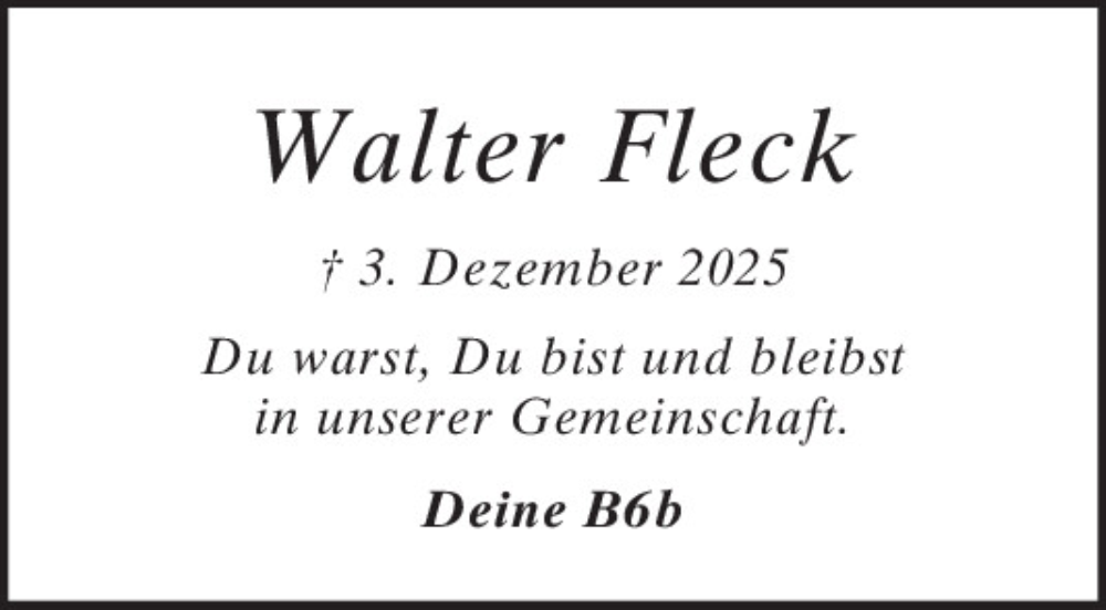 Hier finden Sie alle Traueranzeigen aus der Zeitung, die bisher für Walter Fleck erschienen sind.