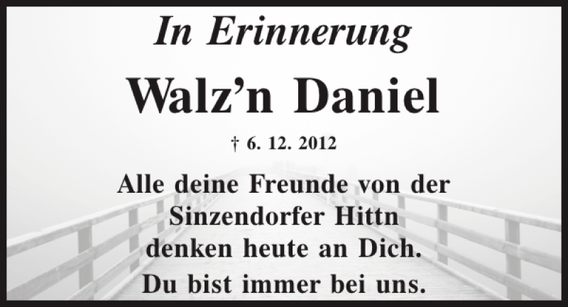 Hier finden Sie alle Traueranzeigen aus der Zeitung, die bisher für Walzn Daniel erschienen sind.