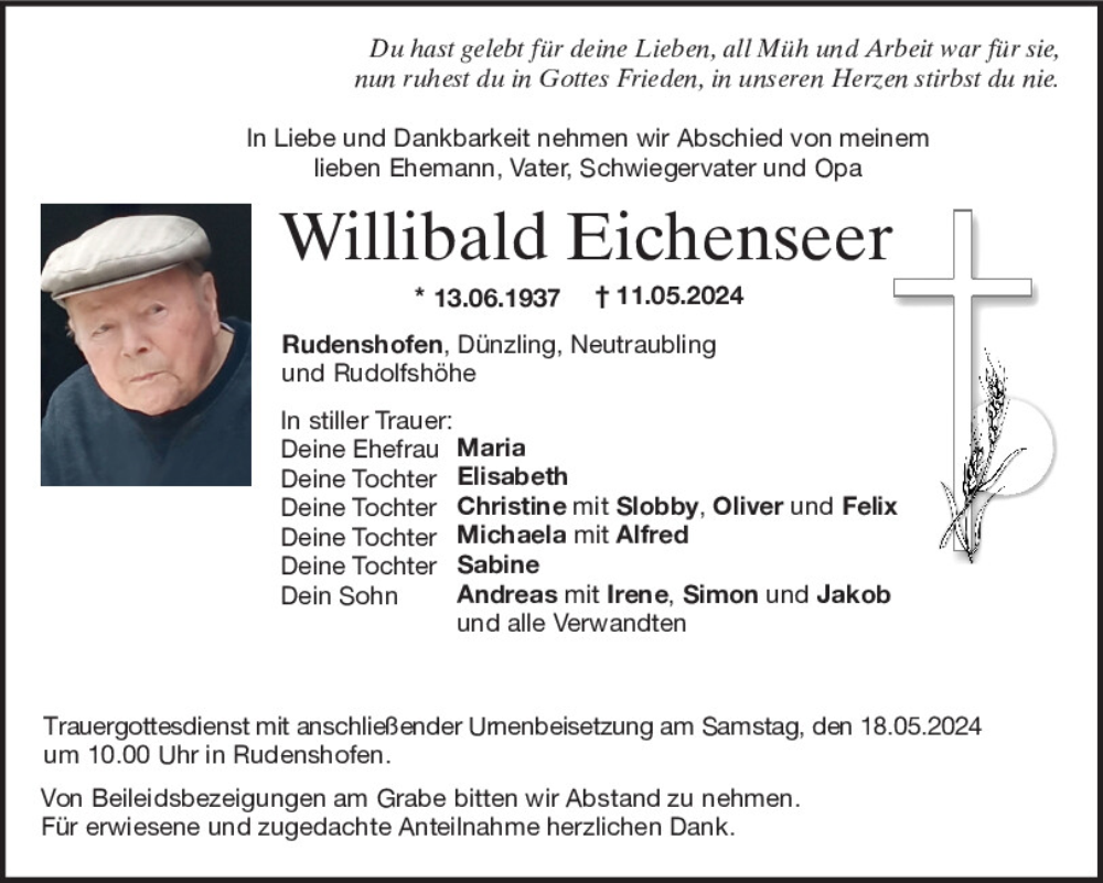 Hier finden Sie alle Traueranzeigen aus der Zeitung, die bisher für Willibald Eichenseer erschienen sind.