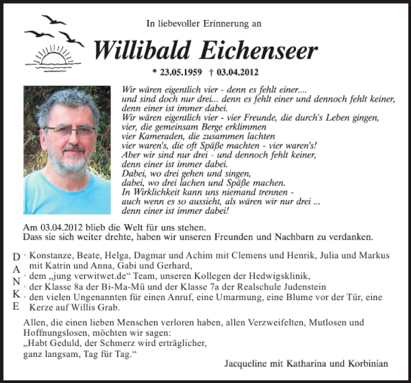 Hier finden Sie alle Traueranzeigen aus der Zeitung, die bisher für Willibald Eichenseer erschienen sind.