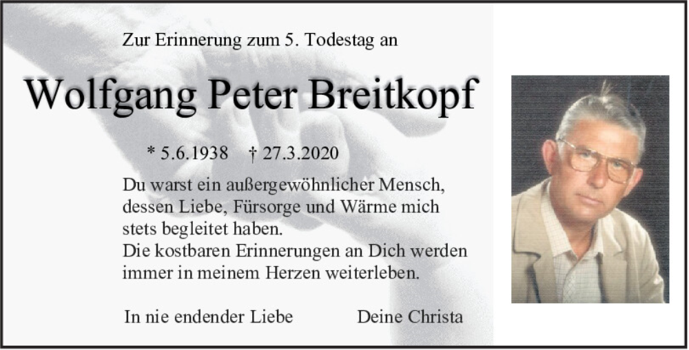Hier finden Sie alle Traueranzeigen aus der Zeitung, die bisher für Wolfgang Breitkopf erschienen sind.