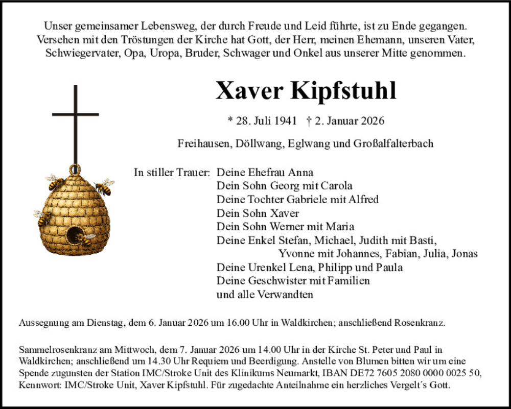 Hier finden Sie alle Traueranzeigen aus der Zeitung, die bisher für Xaver Kipfstuhl erschienen sind.